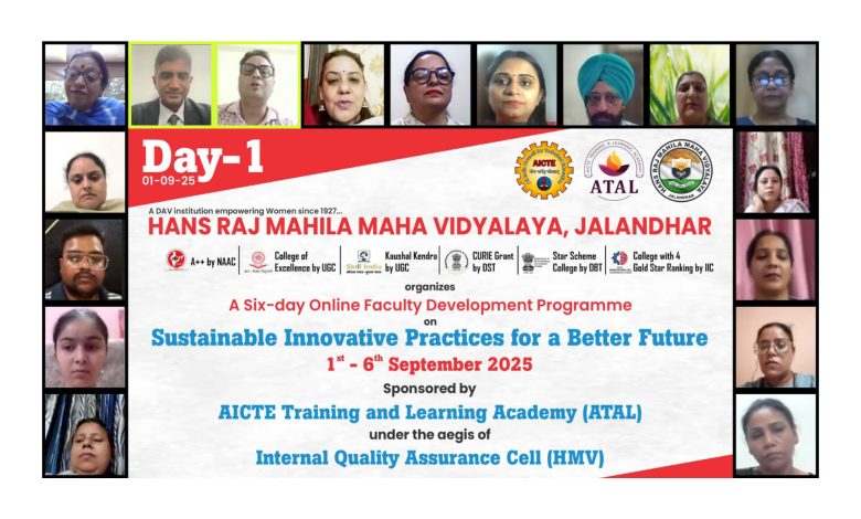 हंस राज महिला महा विद्यालय ने 1 सितम्बर 2025 से एआईसीटीई ट्रेनिंग एंड लर्निंग अकादमी (ATAL) प्रायोजित “सस्टेनेबल इनोवेटिव प्रैक्टिसेस फॉर ए बेटर फ्यूचर” विषय पर छह दिवसीय ऑनलाइन फैकल्टी डेवलपमेंट प्रोग्राम (FDP) की शुरुआत की। कार्यक्रम का शुभारंभ वर्चुअल “ज्योति प्रज्वलन” प्रार्थना और आत्मीय “DAV गान” से हुआ।