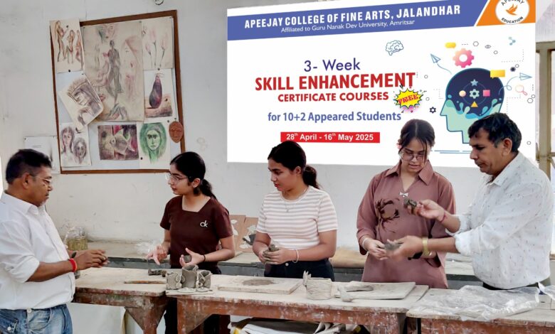 जालंधर, 05 मई (धर्मेंद्र सौंधी) : एपीजे कॉलेज ऑफ फाइन आर्टस जालंधर में +2 की परीक्षाएं दे चुके विद्यार्थियों के लिए लग रही स्किल एनर्हेसमेंट कक्षाओं में विद्यार्थियों ने अंतर्राष्ट्रीय स्स्र पर प्रसिद्ध मूर्तिकला के टिप्स की जानकारी प्राप्त कर रहे हैं। स्कल्पचर विभाग के श्री बासुदेव बिश्वास एवं अध्यक्ष डॉ मोहिंद्र मस्ताना ने विद्यार्थियों को न केवल मिट्टी बल्कि पेपर क्ले, प्लास्ट्र ऑफ पेरिस, एम-सील से भी मूर्ति बनाने की ट्रेनिंग दे रहे हैं। वे विद्यार्थियों से राउंड एवं रिलीफ दोनों प्रकार के स्कल्पचर्स बनवा रहे हैं जिससे विद्यार्थियों को 2 डाइमेंशनल एवं 3 डाइमेंशनल के अन्तर्गत शेप एवं फार्म बनाने की जानकारी भी प्राप्त हो जाएगी।