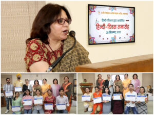 इस अवसर पर प्राचार्य डॉ. नीरजा ढींगरा ने अपने विचार व्यक्त करते हुए कहा कि भारत में जन्म लेना हिंदी भाषा स्वाभाविक रूप से हमारे जीवन का हिस्सा बन जाती है और इस भाषा को अपनाकर और अपने दैनिक जीवन में इसका उपयोग करना हमारा नैतिक कर्तव्य है। इसके अलावा, हम सिर्फ भाषा ही नहीं बल्कि इस भाषा में लिखे गए समृद्ध साहित्य का जश्न मना रहे हैं। इस आयोजन को सफल बनाने के लिए विभागाध्यक्ष डॉ. अंजना ने सभी के प्रति आभार व्यक्त किया। सभी विजेता छात्रों को प्रशस्ति पत्र देकर पुरस्कृत किया गया और उन सभी छात्रों को उपहार दिए गए जिन्होंने इसमें भाग लिया और पुरस्कार जीते।