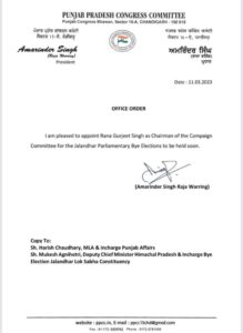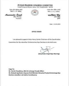जालंधर, 11 मार्च (धर्मेन्द्र सौंधी) : विस लोकसभा चुनाव को लेकर पंजाब कांग्रेस के अध्यक्ष अमरिंदर सिंह राजा वाड़िंग ने कमर कस ली है। इसी के तहत राजा वड़िंग ने नार्थ हलके से विधायक अवतार हेनरी जूनियर और पूर्व कैबिनेट मंत्री राणा गुरजीत सिंह को आगामी संसदीय उपचुनाव के लिए तालमेल कमेटी का चेयरमैन नियुक्त किया है।