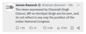 जयराम रमेश द्वारा दिए गए इस बयान पर पंजाब में सियासत गरमा गई है। जयराम रमेश द्वारा दिए गए बयान के बाद सांसद चन्नी अपनी ही पार्टी में अलग-थलग होते हुए नजर आ रहे हैं। क्योंकि पार्टी ने अमृतपाल को लेकर अपना रुख साफ कर दिया है। न्यूज़ लिंकर्स द्वारा कल इसे प्रमुखता से प्रकाशित भी किया गया था।