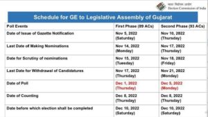 गुजरात, 03 नवंबर (धर्मेंद्र सौंधी) : गुजरात में विधानसभा चुनाव की तारीखों का आज गुरुवार को ऐलान हो चुका है। गुजरात में 1 दिसंबर और 5 दिसंबर को दो चरणों में मतदान होगा। गुजरात में हिमाचल प्रदेश के साथ ही 8 दिसंबर को मतगणना होगी। पहले चरण में 1 दिसंबर 2023 को तथा दूसरे चरण में 5 दिसंबर 2023 को मतदान होगा। मतगणना 8 दिसंबर को हिमाचल विधानसभा चुनाव नतीजों के साथ होगी।