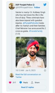 वहीं पंजाब के डीजीपी गौरव यादव ने ड्यूटी के दौरान अपने प्राणों की आहुति देने वाले शहीद कांस्टेबल कुलदीप सिंह को शत शत नमन किया। मुख्यमंत्री ने शहीद के परिवार को दो करोड़ रुपये की अनुग्रह राशि देने की घोषणा की है।