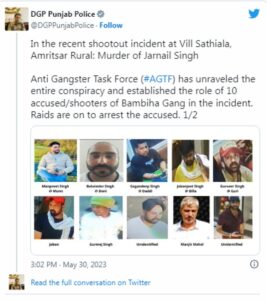 चंडीगढ़, 30 मई (ब्यूरो) : गांव सठियाला में हुई गोलीबारी में गैंगस्टर जरनैल सिंह की हत्या के मामले में बड़ी खबर सामने आई है। डीजीपी गौरव यादव ने जानकारी देते हुए बताया कि एंटी गैंगस्टर टास्क फोर्स (एजीटीएफ) ने पूरी साजिश का पर्दाफाश किया है और घटना में बंबीहा गैंग के 10 आरोपियों/शूटरों की भूमिका स्थापित की है।