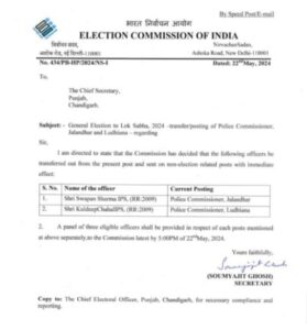 चुनाव आयोग द्वारा जालंधर और लुधियाना के पुलिस कमिश्नरों का तबादला