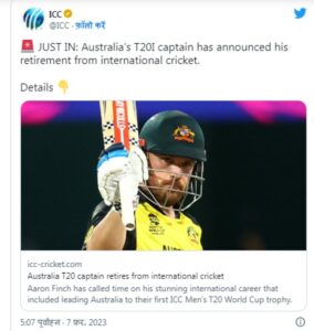 मेलबॉर्न, 07 फरवरी (ब्यूरो) : ऑस्ट्रेलिया टीम के टी20 टीम के कप्तान एरोन फिंच ने इंटरनेशनल क्रिकेट के सभी फॉर्मेट से संन्यास लेने का ऐलान किया। फिंच टेस्ट और वनडे क्रिकेट से पहले ही संन्यास ले चुके थे और अब उन्होंने टी20 से भी संन्यास की घोषणा कर दी।
