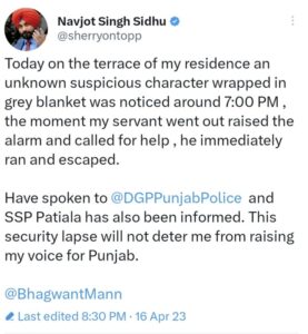 इस बात का खुलासा खुद नवजोत सिंह सिद्धू ने सोशल मीडिया के जरिए किया है। जिसमें उन्होंने कहा कि आज मेरे निवास की छत पर एक ग्रे कंबल में लिपटे एक अज्ञात संदिग्ध व्यक्ति को शाम के करीब 7:00 बजे देखा गया, जैसे ही मेरे नौकर ने अलार्म बजाया और मदद के लिए पुकारा, वह तुरंत भागा और भाग गया।