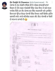 इसके लिए उन्होंने सभी से सहयोग मांगा और कहा कि यह पंजाबी मातृभाषा के सम्मान के लिए है। मुख्यमंत्री द्वारा अंग्रेजी में लिखे गए पत्र की चर्चा हर तरफ हो रही है। वहीं हाल ही में दलजीत सिंह चीमा ने सीएम मान द्वारा जारी किए पर को लेकर निशाना साधा है।