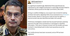मलेरकोटला से पकड़े जासूसों को लेकर पंजाब पुलिस के DGP गौरव यादव ने लिखा- मलेरकोटला पुलिस ने नई दिल्ली स्थित पाकिस्तान हाई कमीशन में तैनात एक पाकिस्तानी अधिकारी से जुड़े 2 जासूसों को गिरफ्तार कर लिया गया है।