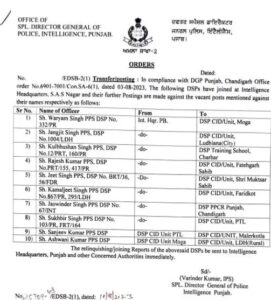 चंडीगढ़, 11 अगस्त (ब्यूरो) : पंजाब में अभी अभी पुलिस अधिकारियों के तबादले किए गए हैं। पंजाब सरकार ने एक बार फिर से पुलिस विभाग में फेरबदल किया है। सरकार ने डीएसपी रैंक के 10 अधिकारियों को स्थानांतरित कर दिया है।
