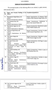 पंजाब सरकार ने तुरंत प्रभाव से बड़ी संख्या में आईएएस अधिकारियों के ट्रांसफर कर दिए हैं। तब्दील किए गए आईएएस अधिकारियों में चंडीगढ़ के रहे सहायक संपदा अधिकारी एवं आईएएस अधिकारी अमित तलवार को मोहाली का नया जिलाधीश नियुक्त किया गया है। अमित तलवार के अलावा अमृतसर के जिलाधीश गुरप्रीत सिंह खेहरा को मुक्तसर भेजा गया है, जबकि पटियाला के डीसी संदीप हंस को होशियापुर, पठानकोट के सन्याम अग्रवाल को मलेरकोटला, मुक्तसर के हरप्रीत सिंह सुदान को अमृतसर, फरीदकोट के हरबीर सिंह को पठानकोट, साक्षी साहनी को जिलाधीश पटियाला, रूही डग को जिलाधीश फरीदकोट, प्रीति यादव को डीसी रोपड़, हिमांशु अग्रवाल को जिलाधीश फाजिल्का व अमित तलवार को जिलाधीश मोहाली नियुक्त किया गया है।