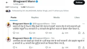 मुख्यमंत्री भगवंत मान ने एक्स पर लिखा है कि अत्यधिक ठंड को देखते हुए पंजाब के 10वीं कक्षा तक के सभी सरकारी और प्राइवेट स्कूलों में 8 जनवरी से 14 जनवरी तक छुट्टियां करने का फैसला किया गया है।
