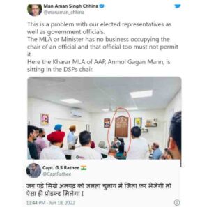 जानकारी के मुताबिक आम आदमी पार्टी की खरड़ से MLA अनमोल गगन मान DSP की कुर्सी पर बैठ गई। किसी ने इसकी तस्वीर खींची और सोशल मीडिया पर वायरल कर दी।