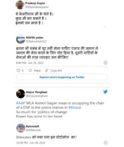 इसे लेकर अब सोशल मीडिया पर ‘आप’ विधायक की खूब खिंचाई हो रही है। विधायक के इस रवैए को लोग सत्ता का गुरूर करार दे रहे हैं। हालांकि एमएलए अनमोल गगन मान की तरफ से इस पर कोई भी प्रतिक्रिया नहीं दी गई।