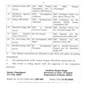 चंडीगढ़, 21 फरवरी (ब्यूरो) : पंजाब सरकार द्वारा पंजाब में तैनात 21 आईपीएस अधिकारियों के तबादले किए गए। पढ़ें पूरी लिस्ट :