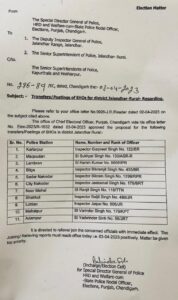 जालंधर, 03 अप्रैल (कबीर सौंधी) : पुलिस विभाग में पिछले कुछ दिनों से बड़े स्तर पर तबादले किए जा रहे है। वहीं अब जारी आदेशों के तहत देहात थानों के 11 एसएचओ के तबादले किए गए। देखें लिस्ट :
