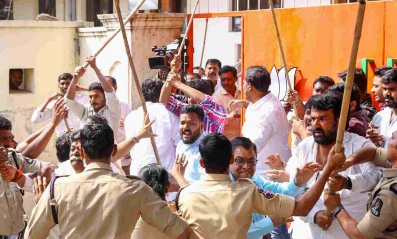 हैदराबाद, 07 जनवरी (ब्यूरो) : भाजपा के पूर्व सांसद रमेश बिधूड़ी की कांग्रेस महासचिव प्रियंका गांधी वाड्रा पर की गयी एक टिप्पणी के विरोध में तेलंगाना में मंगलवार को कांग्रेस कार्यकर्ताओं ने भाजपा के प्रदेश कार्यालय पर पथराव किया और वहां घुसने की कोशिश की, जिसके बाद दोनों दलों के कार्यकर्ताओं के बीच तीखी झड़प हो गयी। यह झड़प तब हुई, जब कांग्रेस कार्यकर्ताओं ने भाजपा के प्रदेश कार्यालय में घुसने का प्रयास किया और यहां पथराव भी किया।