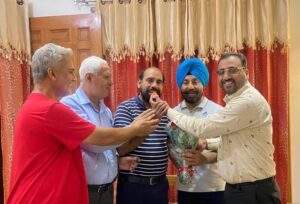 जालंधर, 11 जुलाई (कबीर सौंधी) : आज सूर्य एनक्लेव डेवलपमेंट सोसाइटी के सदस्यों में खुशी की लहर दौड़ गई जब उन्हें पता लगा कि डी.ए.वी कॉलेज मैनेजमेंट की ओर से प्रोफेसर सुरेंद्र कुमार मिड्ढा जी को डी.ए.वी कॉलेज फिल्लौर का प्रिंसिपल बनाया गया। इस खुशी के मौके पर सोसायटी मेंबरो ने प्रोफेसर सुरेंद्र कुमार मिड्ढा जी को फूलों का गुलदस्ता देकर सम्मानित किया और सोसायटी अध्यक्ष मुकेश वर्मा,