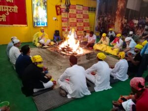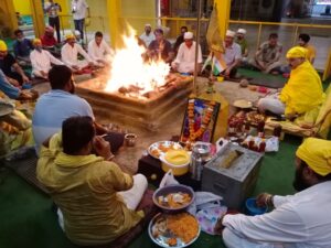 हवन यज्ञ में आहुतियाँ डालते हुए धाम के संस्थापक व संचालक नवजीत भारद्वाज व अन्य