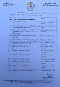 चंडीगढ़, 04 फरवरी (ब्यूरो) : मान सरकार ने आज विभिन्न बोर्डों, कारपोरेशनों और आयोगों के चेयरमैनों के नामों की आज घोषणा की है। हरचंद सिंह बरसट को पंजाब मंडी बोर्ड का चेयरमैन नियुक्त किया गया है। कुल 13 नामों की घोषणा की गई है।