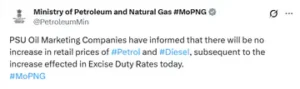 दिल्ली, 07 अप्रैल (ब्यूरो) : सरकार ने पेट्रोल-डीजल पर एक्साइज ड्यूटी 2 रुपए प्रति लीटर बढ़ा दी है। हालांकि, आधे घंटे बाद ये भी साफ किया कि इससे पेट्रोल-डीजल के दाम नहीं बढ़ेंगे। इसे कच्चे तेल की घटी कीमतों से एडजस्ट किया जाएगा।