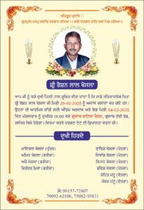 अंतिम अरदास एवं भोग दोपहर 1 बजे गुलाब वाटिका पैलेस, गुलाब देवी रोड, जालंधर में होगा। न्यूज 24 पंजाब की टीम परमपिता परमात्मा से प्रार्थना करती है कि वे दिवंगत आत्मा को अपने श्रीचरणों में स्थान दें।
