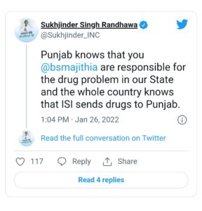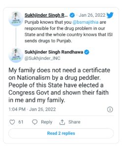 ਚੰਡੀਗੜ੍ਹ, 25 ਜਨਵਰੀ (ਬਿਊਰੋ) : ਬਿਕਰਮ ਮਜੀਠੀਆ ਵੱਲੋਂ ਅੱਜ ਪ੍ਰੈੱਸ ਕਾਨਫਰੰਸ ਕਰਕੇ ਕਾਂਗਰਸੀ ਆਗੂਆਂ ਤੇ ਗੰਭੀਰ ਇਲਜ਼ਾਮ ਲਗਾਏ ਗਏ । ਜਿਸ ਦਾ ਜਵਾਬ ਦਿੰਦੇ ਹੋਏ ਗ੍ਰਹਿ ਮੰਤਰੀ ਸੁਖਜਿੰਦਰ ਸਿੰਘ ਰੰਧਾਵਾ ਨੇ ਕਿਹਾ ਕਿ ”ਪੰਜਾਬ ਜਾਣਦਾ ਹੈ ਕਿ ਤੁਸੀਂ(ਬਿਕਰਮ ਮਜੀਠੀਆ) ਪੰਜਾਬ ਵਿੱਚ ਨਸ਼ਿਆਂ ਦੀ ਸਮੱਸਿਆ ਲਈ ਜਿੰਮੇਵਾਰ ਹੋ।” ਉਹਨਾਂ ਕਿਹਾ ਕਿ ਪੰਜਾਬ ਦੇ ਲੋਕਾਂ ਨੇ ਕਾਂਗਰਸ ਅਤੇ ਉਹਨਾਂ ਤੇ ਭਰੋਸਾ ਕਰਦੇ ਹੋਏ ਪੰਜਾਬ ਵਿੱਚ ਕਾਂਗਰਸ ਪਾਰਟੀ ਦੀ ਸਰਕਾਰ ਬਣਾਈ ਸੀ।