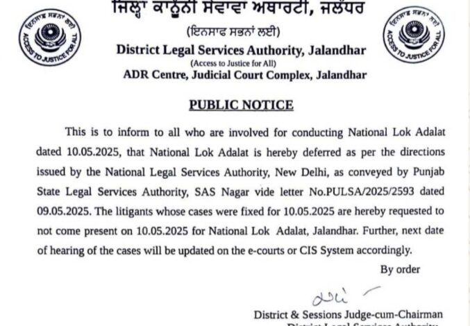 ਜਲੰਧਰ, 09 ਮਈ (ਹਰਜਿੰਦਰ ਸਿੰਘ) : ਜਿਲ੍ਹਾ ਅਤੇ ਸੈਸ਼ਨਜ਼ ਜੱਜ ਜਲੰਧਰ ਸ੍ਰੀ ਨਿਰਭਉ ਸਿੰਘ ਗਿੱਲ ਨੇ ਦੱਸਿਆ ਕਿ 10 ਮਈ 2025 ਨੂੰ ਲੱਗਣ ਵਾਲੀ ਰਾਸ਼ਟਰੀ ਲੋਕ ਅਦਾਲਤ ਨੂੰ ਰਾਸ਼ਟਰੀ ਕਾਨੂੰਨੀ ਸੇਵਾਵਾਂ ਅਥਾਰਟੀ, ਨਵੀਂ ਦਿੱਲੀ ਅਤੇ ਪੰਜਾਬ ਕਾਨੂੰਨੀ ਸੇਵਾਵਾਂ ਅਥਾਰਿਟੀ ਦੁਆਰਾ ਜਾਰੀ ਨਿਰਦੇਸ਼ਾਂ ਅਨੁਸਾਰ ਮੁਲਤਵੀ ਕਰ ਦਿੱਤਾ ਗਿਆ ਹੈ।