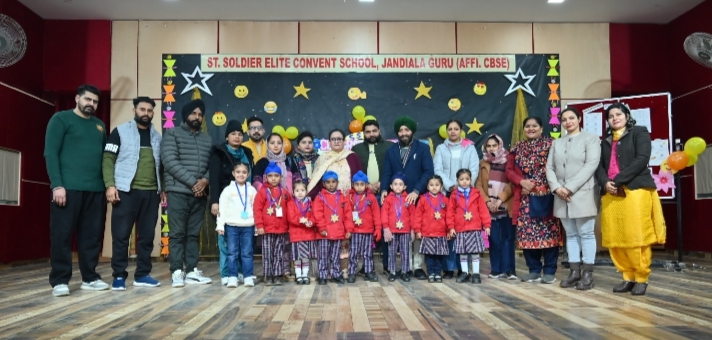 ਜੰਡਿਆਲਾ ਗੁਰੂ, 29 ਜਨਵਰੀ (ਕੰਵਲਜੀਤ ਸਿੰਘ) : ਸੇਂਟ ਸੋਲਜ਼ਰ ਇਲੀਟ ਕਾਨਵੈਂਟ ਸਕੂਲ, ਜੰਡਿਆਲਾ ਗੁਰੂੂੂ ਦੇ ਵਿਹੜੇ ਵਿੱਚ ਅੱਜ ਕਿੰਡਰਗਾਰਟਨ ਬਲਾਕ ਦੇ ਪਲੇਅਪੈਨ ਅਤੇ ਐਲ.ਕੇ.ਜੀ. ਜਮਾਤ ਦਾ ਨਤੀਜਾ ਘੋਸ਼ਿਤ ਕੀਤਾ ਗਿਆ। ਸਵੇਰ ਤੋਂ ਹੀ ਮਾਪੇ ਆਪਣੇ ਬੱਚਿਆਂ ਨਾਲ ਉਨ੍ਹਾਂ ਦਾ ਨਤੀਜਾ ਵੇਖਣ ਲਈ ਬੇਤਾਬ ਸਨ। ਸਕੂਲ ਦਾ ਨਤੀਜਾ 100% ਰਿਹਾ।ਸਕੂਲ ਦੇ ਐੱਮ.ਡੀ. ਸ. ਮੰਗਲ ਸਿੰਘ ਕਿਸ਼ਨਪੁਰੀ ਅਤੇ ਪ੍ਰਿੰਸੀਪਲ ਅਮਰਪ੍ਰੀਤ ਕੌਰ ਜੀ ਨੇ ਸਟੇਜ ਤੇ ਪਹਿਲਾ, ਦੂਜਾ ਅਤੇ ਤੀਜਾ ਦਰਜਾ ਪ੍ਰਾਪਤ ਬੱਚਿਆਂ ਨੂੰ ਸਰਟੀਫਿਕੇਟ ਅਤੇ ਇਨਾਮ ਦੇ ਕੇ ਸਨਮਾਨਿਤ ਕੀਤਾ।