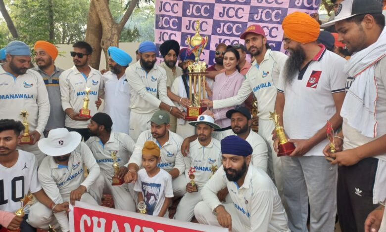 ਜੰਡਿਆਲਾ ਗੁਰੂ 8 ਮਈ :-(ਕੰਵਲਜੀਤ ਸਿੰਘ ਲਾਡੀ ਸੁਖਜਿੰਦਰ ਸਿੰਘ) : ਅੱਜ ਸੰਤ ਬਾਬਾ ਤੇਜਾ ਸਿੰਘ ਜੀ ਯਾਦ ਵਿੱਚ ਚੌਥਾ ਕ੍ਰਿਕਟ ਟੂਰਨਾਮੈਂਟ ਜੋਤੀਸਰ ਕ੍ਰਿਕਟ ਕਲੱਬ ਵੱਲੋਂ ਦੂਸਹਿਰਾ ਗਰਾਊਂਡ ਵਿਖੇ ਕਰਵਾਇਆ ਗਿਆ। ਇਸ ਟੂਰਨਾਮੈਂਟ ‘ਚ ਮਾਨਾਂਵਾਲਾ ਕ੍ਰਿਕਟ ਕਲੱਬ ਨੇ ਅੰਮ੍ਰਿਤਸਰ ਇਲੈਵਨ ਕ੍ਰਿਕਟ ਕਲੱਬ ਨੂੰ ਹਰਾਕੇ ਜਿਤ ਹਾਸਲ ਕੀਤੀ । ਮਾਨਾਵਾਲਾ ਟੀਮ ਟੋਨੀ ਅਤੇ ਅੰਮ੍ਰਿਤ ਨੇ ਸ਼ਾਨਦਾਰ ਬੈਟਿੰਗ ਕਰਕੇ ਜਿੱਤ ਹਾਸਲ ਕਰਨ ਵਿਚ ਅਹਿਮ ਯੋਗਦਾਨ ਪਾਇਆ।