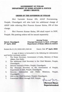 ਚੰਡੀਗੜ੍ਹ, 04 ਅਪ੍ਰੈਲ (ਬਿਊਰੋ) : ਪੰਜਾਬ ਸਰਕਾਰ ਵੱਲੋਂ 2 ਸੀਨੀਅਰ IPS ਅਫ਼ਸਰਾਂ ਦਾ ਕੀਤਾ ਤਬਾਦਲਾ.... ਦੇਖੋ ਲਿਸਟ