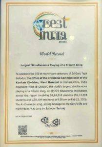 ਮੁੰਬਈ, 25 ਫਰਵਰੀ (ਬਲਰਾਜ ਸਿੰਘ ਰਾਜਾ) : ਮੁੱਖ ਮੰਤਰੀ ਸ੍ਰੀ ਦੇਵੇਂਦਰ ਫੜਨਵੀਸ ਦੇ ਵਿਸ਼ੇਸ਼ ਸਹਿਯੌਗ ਤੇ ਦਮਦਮੀ ਟਕਸਲ ਮੁਖੀ ਸੰਤ ਗਿਆਨੀ ਹਰਨਾਮ ਸਿੰਘ ਖਾਲਸਾ ਦੀ ਸਰਪ੍ਰਸਤੀ ‘ਚ ਮਹਾਰਾਸ਼ਟਰ ਵਿਖੇ 28 ਫਰਵਰੀ ਤੇ 1 ਮਾਰਚ ਨੂੰ ਖਾਰਘਰ (ਨਵੀਂ ਮੁੰਬਈ) ਦੇ ਉਵੇ ਮੈਦਾਨ ‘ਚ ਜੋ ਸ਼ਹੀਦੀ ਸ਼ਤਾਬਦੀ ਸਮਾਗਮ ਮਨਾਏ ਜਾ ਰਹੇ ਹਨ,ਉਸ ਤੋਂ ਪਹਿਲਾਂ ਮਹਾਰਾਸ਼ਟਰ ਸਰਕਾਰ ਦੇ ਵਿਸ਼ੇਸ਼ ਉਪਰਾਲੇ ਸਦਕਾ ਬੀਤੀ 23 ਫਰਵਰੀ ਨੂੰ ਠੀਕ ਸਵੇਰੇ 9 ਵਜੇ ਕੋਂਕਣ ਖੇਤਰ ਦੀਆਂ ਕੁਲ 20,239 ਸੰਸਥਾਵਾਂ ਤੋਂ 51,13,208 ਵਿਦਿਆਰਥੀਆਂ ਤੇ 1,50,104 ਅਧਿਆਪਕਾਂ ਵੱਲੋਂ ਹਿੰਦ-ਦੀ-ਚਾਦਰ ਸ੍ਰੀ ਗੁਰੂ ਤੇਗ ਬਹਾਦਰ ਸਾਹਿਬ ਜੀ ਦੀ ਸ਼ਹਾਦਤ ਨੂੰ ਨਮਨ ਹੁੰਦੇ ਹੋਏ ਸਮੂਹਿਕ ਤੌਰ ‘ਤੇ ਇੱਕ ਹੀ ਸਮੇਂ ‘ਹਿੰਦ-ਦੀ-ਚਾਦਰ’ਸ਼ਰਧਾਂਜ਼ਲੀ ਗੀਤ ਦੀ ਪੇਸ਼ਕਾਰੀ ਕੀਤੀ ਗਈ,ਜਿਸ ਤੋਂ ਬਾਅਦ ਦਿੱਲੀ ਸਥਿਤ ਰਿਕਾਰਡ ਰਜਿਸਟਰੀ ‘ਬੈਸਟ ਆਫ਼ ਇੰਡੀਆ ਰਿਕਾਰਡਸ’ ਨੇ 4.45 ਮਿੰਟ ਦੀ ਇਸ ਗੀਤ ਨੂੰ ਦੁਨੀਆ ਦੇ ਸਭ ਤੋਂ ਵੱਡੇ ਇੱਕੋ ਸਮੇਂ ਗਾਏ ਗਏ ਸ਼ਰਧਾਂਜਲੀ ਗੀਤ ਵਜੋਂ ਪ੍ਰਮਾਣਿਤ ਕੀਤਾ ਹੈੈ।