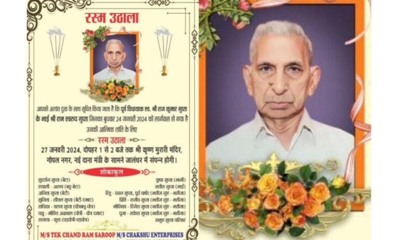 पूर्व विधायक स्वर्गीय राज कुमार गुप्ता के भाई श्री राम स्वरूप गुप्ता का 27 जनवरी शनिवार को होगा रस्म उठाला