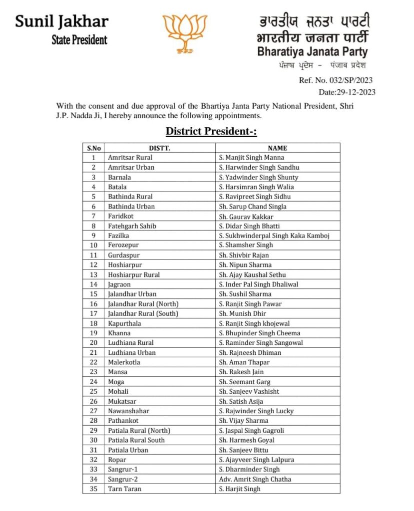 दिल्ली, 29 दिसंबर (ब्यूरो) : भाजपा हाई कमान द्वारा पंजाब में 35 नेताओं को प्रधान बनाने की सूची जारी की गई है।