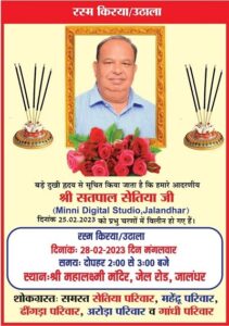 जालंधर, 27 फरवरी (कबीर सौंधी) : मिनी डिजिटल स्टूडियो के मालिक एवं डिजिटल मीडिया एसोसिएशन के सेक्रेटरी सतपाल सेतिया जिनका 25 फरवरी को निधन हो गया था, उनकी आत्मिक शांति के लिए रस्म किरया-उठाला 28 फरवरी को होगी। रस्म किरया दोपहर 2 से 3 बजे तक जेल रोड स्थित श्री महालक्ष्मी मंदिर में होगी।