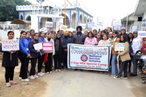 जालंधर, 30 दिसंबर (धर्मेंद्र सौंधी) : एनएसएस कैंप के सातवें दिन की शुरुआत हंस राज महिला महाविद्यालय जालंधर के प्रांगण में डीएवी गान व एनएसएस गीत से हुई। प्राचार्या प्रो. डॉ. (श्रीमती) अजय सरीन ने एनएसएस शिविर के सफल समापन पर पूरी एनएसएस इकाई को बधाई दी। एनएसएस के स्वयंसेवकों ने पिछले दिनों की गई गतिविधियों की रिपोर्ट प्रस्तुत की। कार्यक्रम अधिकारी डॉ. वीना अरोड़ा ने एनएसएस स्वयंसेवकों को संबोधित करते हुए कहा कि जब हम अपने जीवन में कुछ करने का संकल्प लेते हैं तो भगवान स्वयं हमारे कार्यों में शामिल हो जाते हैं और कार्य बिना किसी अव्यवस्था के पूरा हो जाता है। एनएसएस स्वयंसेवकों ने गाखल गांव में एक जागरूकता शिविर का आयोजन किया और निवासियों को फसलों के अवशेषों को जलाने के परिणामों के बारे में जागरूक किया। स्वयंसेवकों ने “पराली जलाने को मना करें” का नारा लगाया और ग्लोबल वार्मिंग और पर्यावरण के मुद्दों पर अपने विचार प्रस्तुत किए।