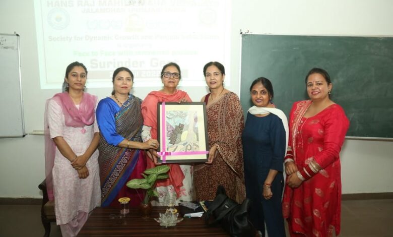 जालंधर (कबीर सौंधी) : पंजाबी और समग्र विकास प्रकोष्ठ के स्नातकोत्तर विभाग ने प्रिंसिपल प्रो डॉ (श्रीमती) अजय सरीन के प्रेरणात्मक समर्थन के तहत एक प्रसिद्ध प्रवासी कवयित्री सुश्री सुरिंदर गीत के साथ एक जीवंत बातचीत रू- ब- रू का आयोजन किया। श्रीमती नवरूप, प्रमुख पंजाबी विभाग और श्रीमती कुलजीत कौर, प्रभारी पंजाबी साहित्य सभा ने अतिथियों का स्वागत किया। सुश्री सुरिंदर गीत ने कनाडा में अपने जीवन के अनुभवों और चुनौतियों के बारे में विस्तार से बताया। उन्होंने अपनी कुछ कविताओं का पाठ किया जो उनके देश के प्रति उनके प्रेम और जीवन के खट्टे-मीठे प्रसंगों को दर्शाती हैं।