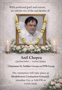 जालंधर, 14 अप्रैल (ब्यूरो) : जालंधर के मशहूर बिज़नेसमैन ओर सेंट सोल्जर ग्रुप के चेयरमैन अनिल चोपड़ा का निधन हो गया है, जिनके निधन की खबर के बाद शहर में शोक की लहर है। अनिल चोपड़ा के बेटे राजन चोपड़ा रमाडा होटल के मालिक हैं ओर दूसरे बेटे प्रिंस Days होटल चलाते है।