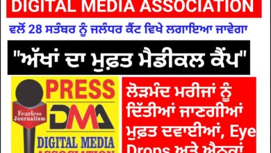 DIGITAL MEDIA ASSOCIATION (DMA) ਵਲੋਂ 28 ਸਤੰਬਰ ਨੂੰ ਜਲੰਧਰ ਕੈਂਟ ਵਿਖੇ ਲਗਾਇਆ ਜਾਵੇਗਾ “ਅੱਖਾਂ ਦਾ ਮੁਫ਼ਤ ਮੈਡੀਕਲ ਕੈਂਪ”, ਮਾਹਿਰ ਡਾਕਟਰ ਕਰਨਗੇ ਮਰੀਜਾਂ ਦੀਆਂ ਅੱਖਾਂ ਦੀ ਜਾਂਚ ਪੜਤਾਲ